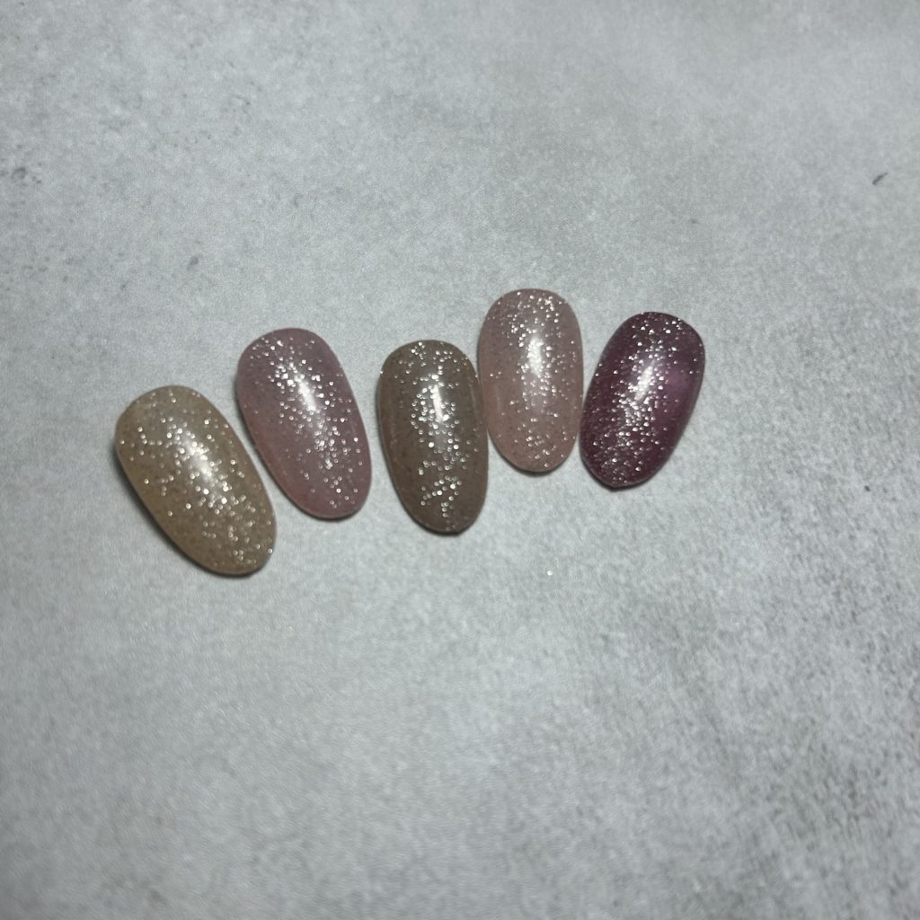 一方、フラッシュネイルは、強い光を受けた際にラメが反射し、フラッシュ撮影時や照明下で華やかに輝くのが特徴です。